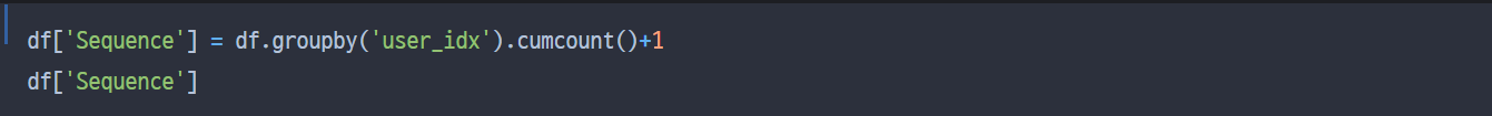 위와 같이 써주면된다. cumcount()를 하면 0부터 시작하기 때문에 +1을 해주어 1부터 시작하게 해주자