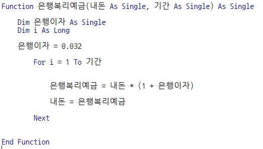 맨 위에 내가 작성한 코드를 간단하게 설명하면, [은행복리예금]이라는 사용자 정의 함수를 만들 건데