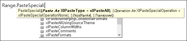 위와 같이 붙여넣기 원하는 Range와. PasteSpecial만 입력하면 도움말이 나오면서 내가 쓸 수 있는 항목을 list화 해준다.