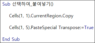 위와 같이 작성하면 된다. 1) 붙여 넣고 싶은 Range를 Copy 하고, 2) 그 후 원하는 Range를 선택하여 PasteSpecial의 Tranpose 항목을 True로 바꾸어 주면 된다.