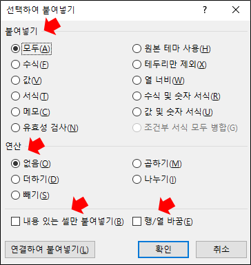 항목을 간단하게 설명하기 위해, 엑셀에서 [선택하여 붙여 넣기] 기능을 살펴보자
