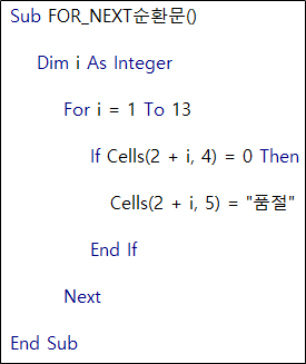 대부분 순차적으로 CELL이나 RANGE 값을 실행할 때 사용하며 기본 형식은 위 코드 과 같다.