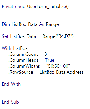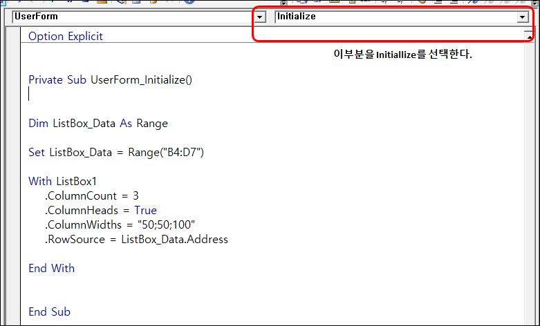 우리는 UserForm을 열자 마자 ListBox에 Data가 있길 원하니 UserForm_Iniitialize를 사용할 것이다.