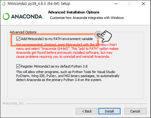 설치시, 아래 Miniconda3를 My Path에서 사용할 수 있도록 설정해놓도록 하자.