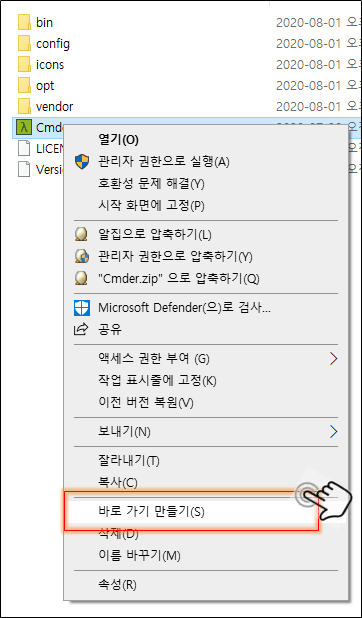 - 설치를 다했으면 설치 폴더에 들어가서 cmder.exe를 바로가기로 만들어서 바탕화면에 만들어주자