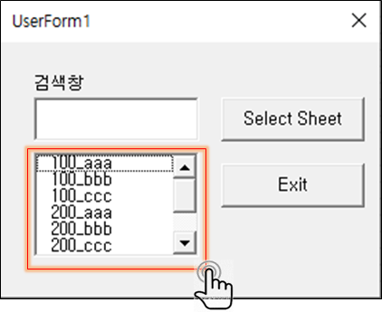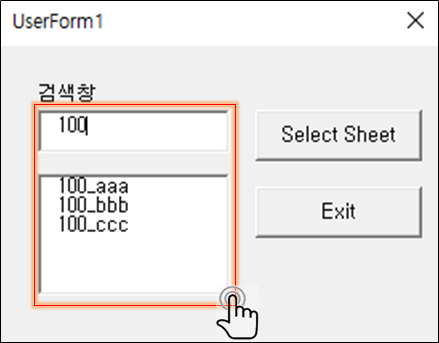 검색창에 100을 입력하였더니, 100의 앞글자를 갖는 Sheets들이 Listbox에 표기된 것을 확인할 수 있습니다.