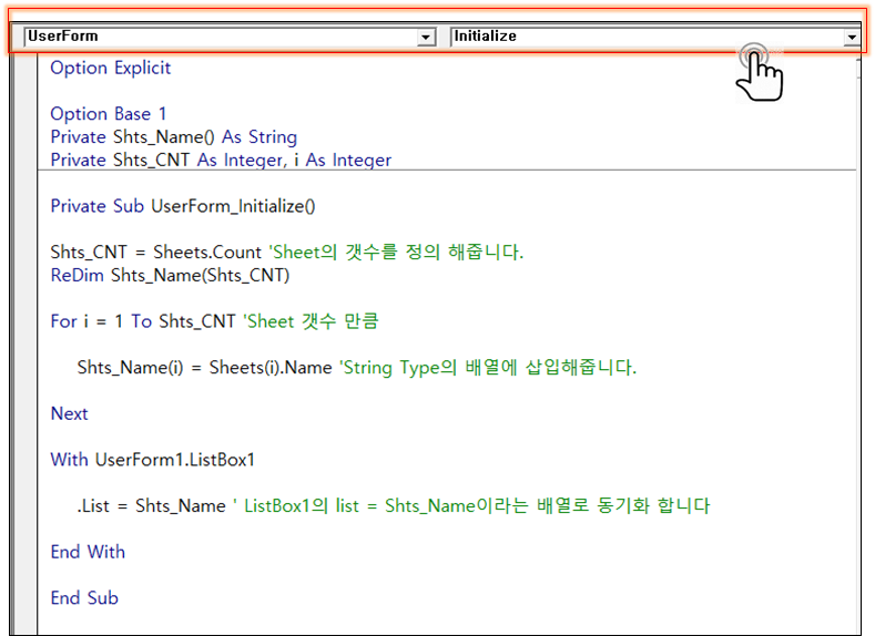 우선 [Userform_Initiallize]를 사용하여 Listbox에 Sheets.name 이 정렬될 수 있는 Code를 작성해 보겠습니다.