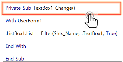 여기서 중요한 점은, TextBox_Change 즉 TextBox의 값이 변하면을 먼저 선택하고