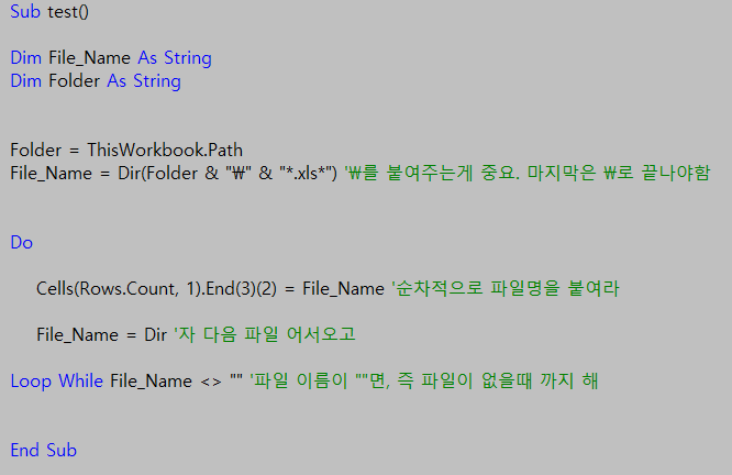 [엑셀 VBA] Dir을 사용하여, 폴더 내 파일명 불러오기.