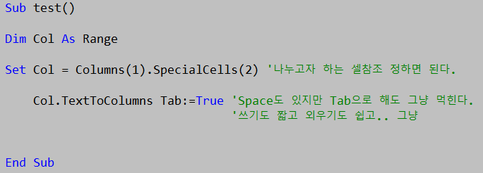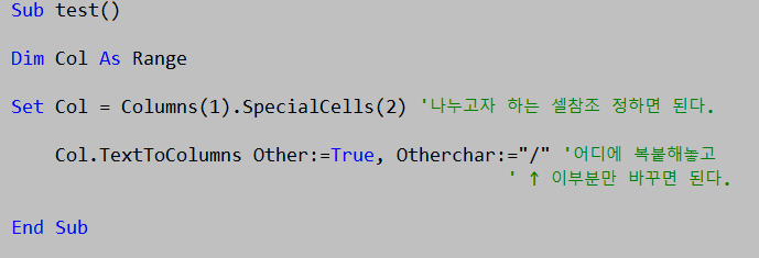 [엑셀 VBA] 텍스트 나누기, TextToColumns 쉽게 하기