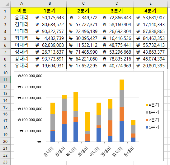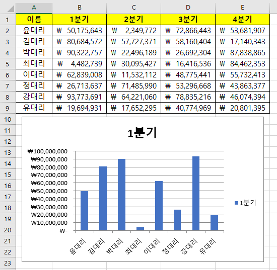 여기서 우리는 "1분기" 계열만 따로 비교하고자 한다.