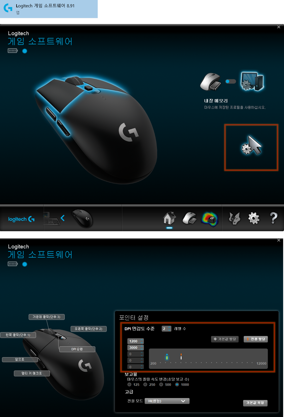 로지텍 마우스는 아래와 같이 DPI를 설정하면 된다.