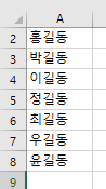 예를 들어 CELL 내 A1:A8까지 길동이란 이름의 사람들의 DATA가 있다고 치자