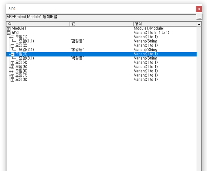 예를 들어 [모임]이라고 선언한 배열 변수를 지역 창으로 보면