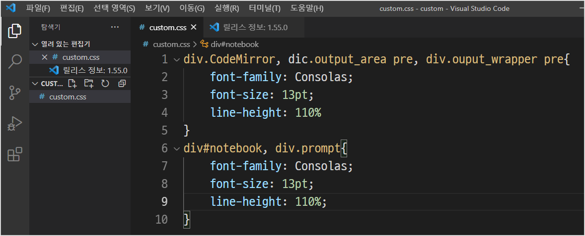4. Visual Studio에 들어가서 해당 폴더에 custom.css 파일 생성 후 코드 작성.