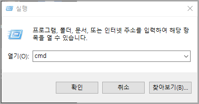 1. 실행 (윈도우 + R) 키를 눌러 실행창을 켠후 cmd를 실행.