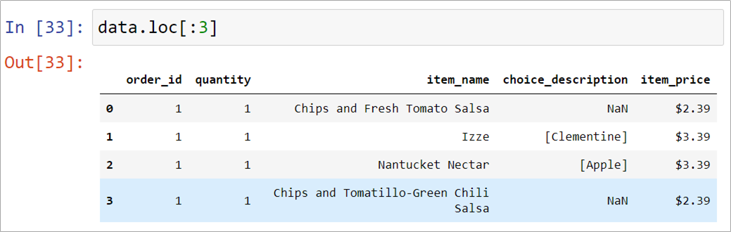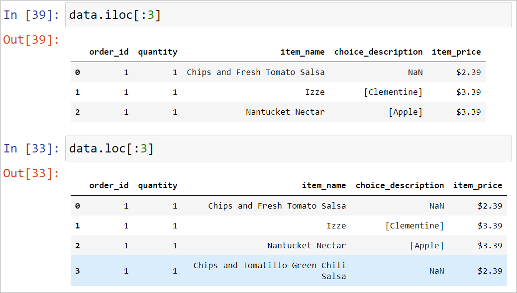 iloc과 똑같은 [ : 3]임에도 아래 파란색의 index 3이 추가 추출된 것을 볼 수 있다.