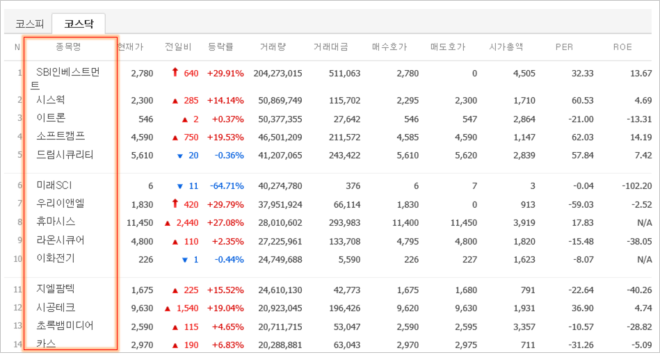 나는 위의 페이지처럼 NAVER 금융 -> 코스닥 -> 거래량 상위 page를 사용할 거다.