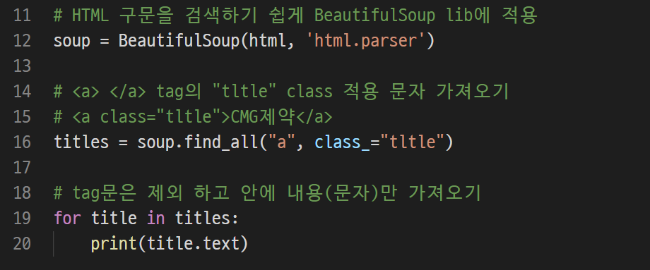 위에서 봤듯이 내가 원하는 것은 <a class = "tltle"> </a>에 쌓여 있으니