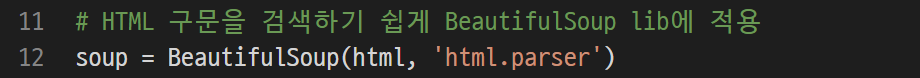 그렇다면 우리가 가져온 HTML 구문을 BeautifulSoup를 적용해준다.